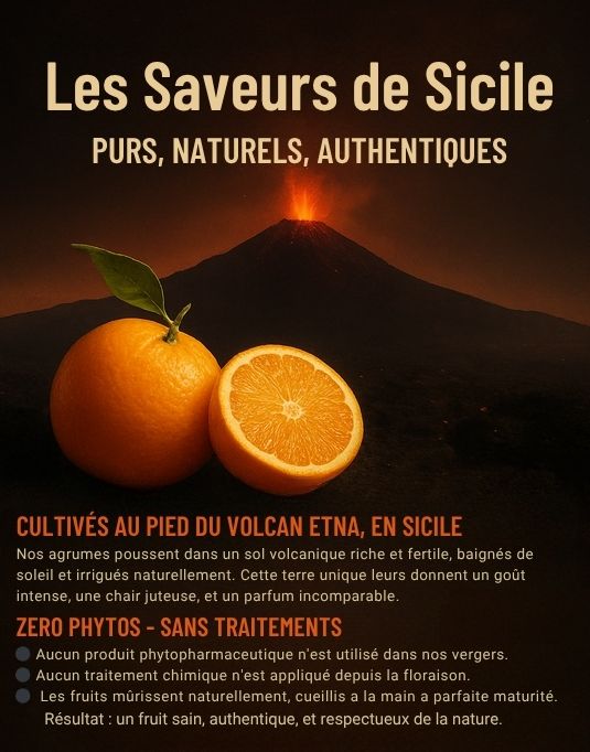 en lien direct avec les vergers siciliens, pour vous offrir une qualité exceptionnelle, une traçabilité totale et un respect des saisons. Nos produits sont disponibles de novembre à mars, et en point de retrait local.